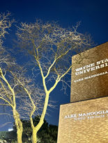 Nighttime silhouette achieved with car headlights.
